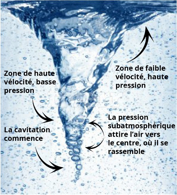 Un écoulement rotationnel ou tourbillonnaire est caractérisé par une zone de basse pression au centre de son axe de rotation et par une zone de haute pression à ses limites extérieures. Ces variations de la pression s'appellent gradients de pression. L'air emprisonné dans l'eau sous forme de macro/microbulles ou de filaments ou agrégats d'air dissous peut être induit vers la zone de basse pression de l'écoulement tourbillonnaire; il peut alors se séparer de l'écoulement, dans les conditions appropriées.